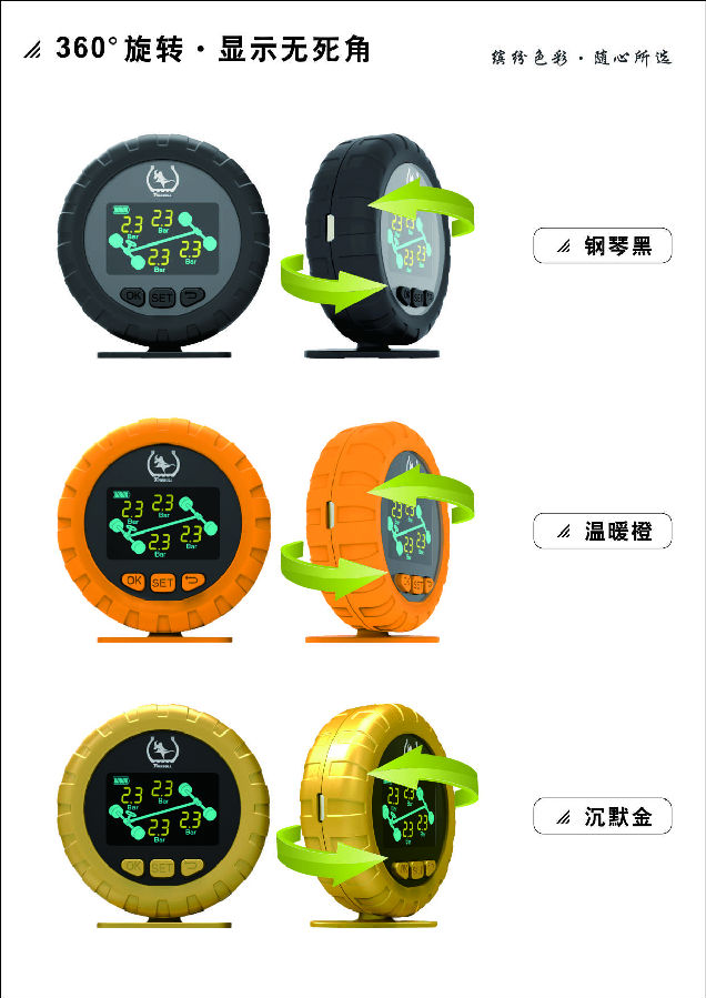 3、钢琴黑、土豪金、温暖橙三种外壳颜色可选,360度旋转,安全无死角!